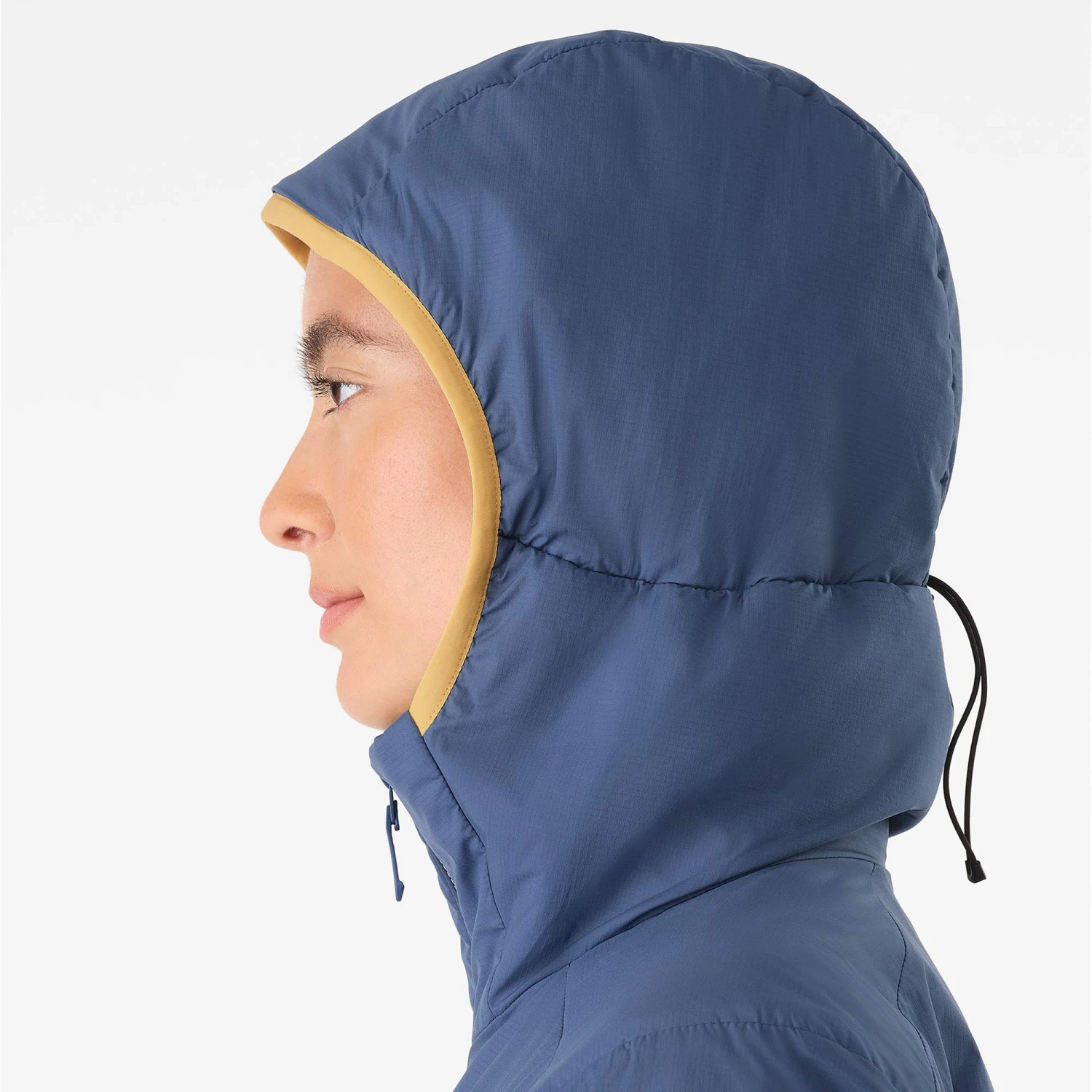 Außen kommt ein imprägniertes, abriebfestes, windabweisendes Nylon zum Einsatz, das für leichten Wetterschutz sorgt. So kann leichter Nieselregen eine Weile abperlen. Dank seitlichen Stretchfleece-Einsätzen wird ein Überhitzen verhindert und der Trägerin mehr Bewegungsfreiheit verschafft. Die Materialien sind glatt in ihrer Oberfläche, damit dir das Schichten unter und über die Jacke leicht von der Hand geht. Dezente Bündchen und eine flexible, weiche StormHood Kapuze passen mit deinen Bekleidungsschichten zusammen, ohne Falten zu schlagen.